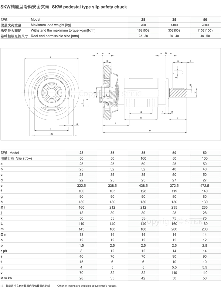 滑动安全夹头允许卷轴在机器运转过程进行轴向调整。 调整可以通过手轮或者自动机构进行。 轴向定位装置确保卷轴安全,准确的传递转矩。 滑动型安全夹头供应 技术参数 单位:mm