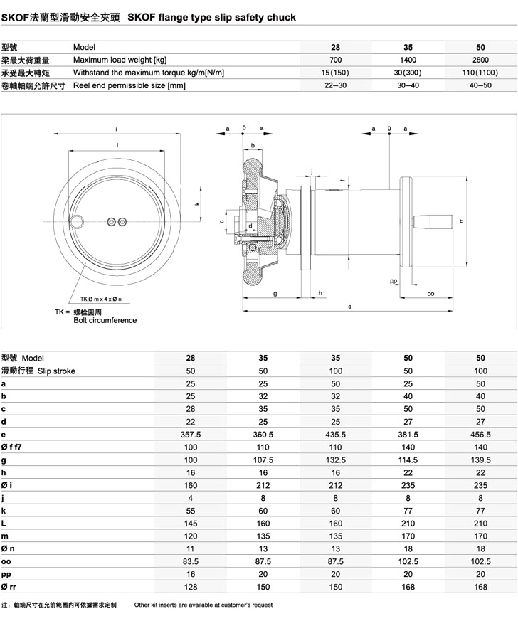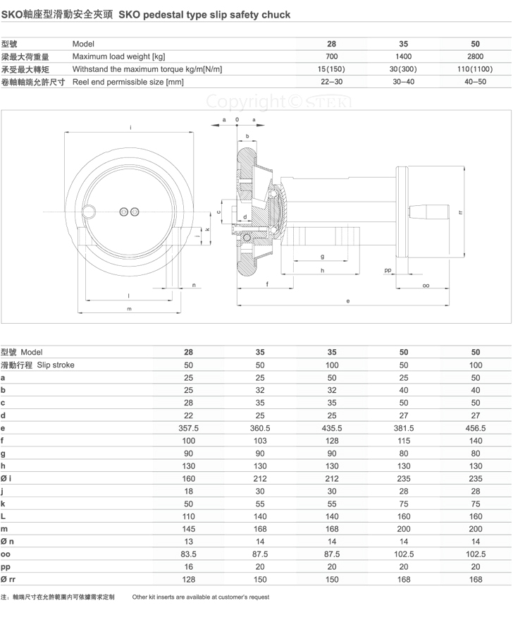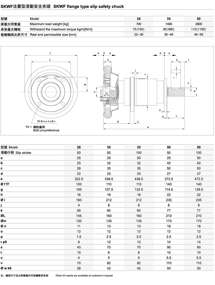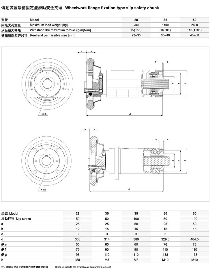 滑动安全夹头允许卷轴在机器运转过程进行轴向调整。 调整可以通过手轮或者自动机构进行。 轴向定位装置确保卷轴安全,准确的传递转矩。 滑动型安全夹头 技术参数 单位:mm