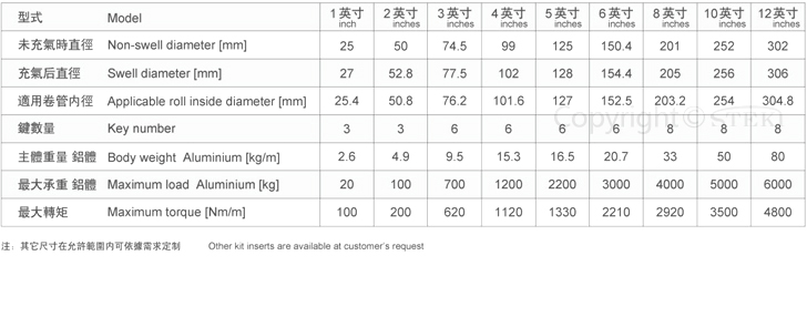 通长键条式气胀轴,收放卷都可适用,多气囊式设计,气囊长度与气涨轴主体相似。 主体材质可选钢或铝;键条材质可选橡胶,铝或聚氨酯。根据用户的特殊要求,可选其他材料。 钢质轴头是按客户的图纸生产,以满足任何特殊的要求。 铝合金主体标准尺寸与规格(见下表),其他尺寸可应要求提供。 通条式铝体气胀轴 技术参数 单位:mm