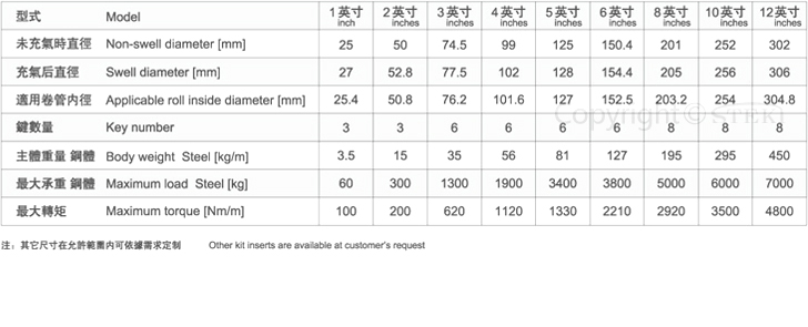 独特的气胀轴设计,气囊和通长键条可以很容易的更换,而不必拆卸轴头。 通气使气囊膨胀时,气涨轴通长键条外径得以扩大,卡住纸管内径。 钢质主体标准尺寸与规格(见下表),其他尺寸可应要求提供。 通条钢体气涨轴生产加工 技术参数 单位:mm