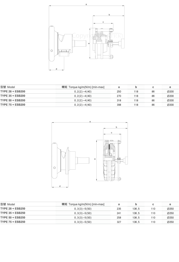 安全夹头与手动制动器的配合 技术参数 单位:mm